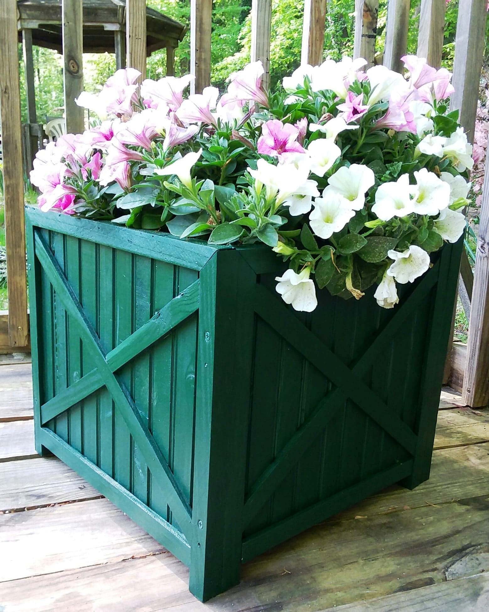 Our handmade cross buck pattern wainscot planter is available in four colors and is custom made to your request. We hand select and recycle southern yellow pine from our construction partners and manufacture this beautiful planter. Planter measures 17" X 17" X 15" tall and comes complete with a heavy duty woven grow bag to protect the interior part of planter . Planter has a lovely cross buck pattern on all four sides. Planter ships un assembled with 8 screws for assembly. All holes are pre drilled so assembly takes about 5 minutes . Planter is protected with a 10 year exterior solid latex stain that protects the outside. This is a true beauty that you will often see at your tropical resorts and coastal locations .